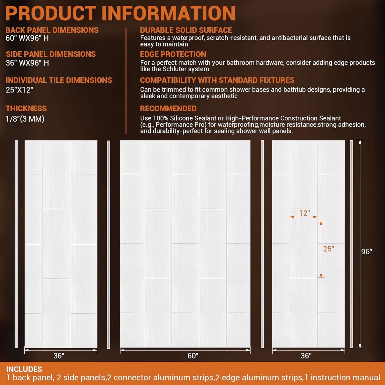 Solid Surface 36D x 60W*96H Tile-Tub and Shower Wall Panels S urround, Inch 1/8"(3mm) Thick, Shower Surround Wall Kit,Gloss White, SMC Material,Aluminum Edge Profiles,Quick Install, Cuttable