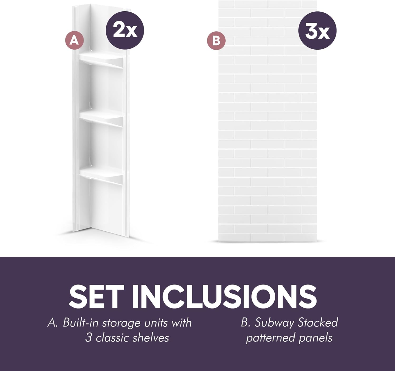 White Polystyrene Tub Wall Surround 36"x 60"x 58" - Waterproof, Easy-to-Install, Two Shelf Units Kit Included - Bathtub Wall Surround Panels - Subway Tiles Pattern, Classic Shelves